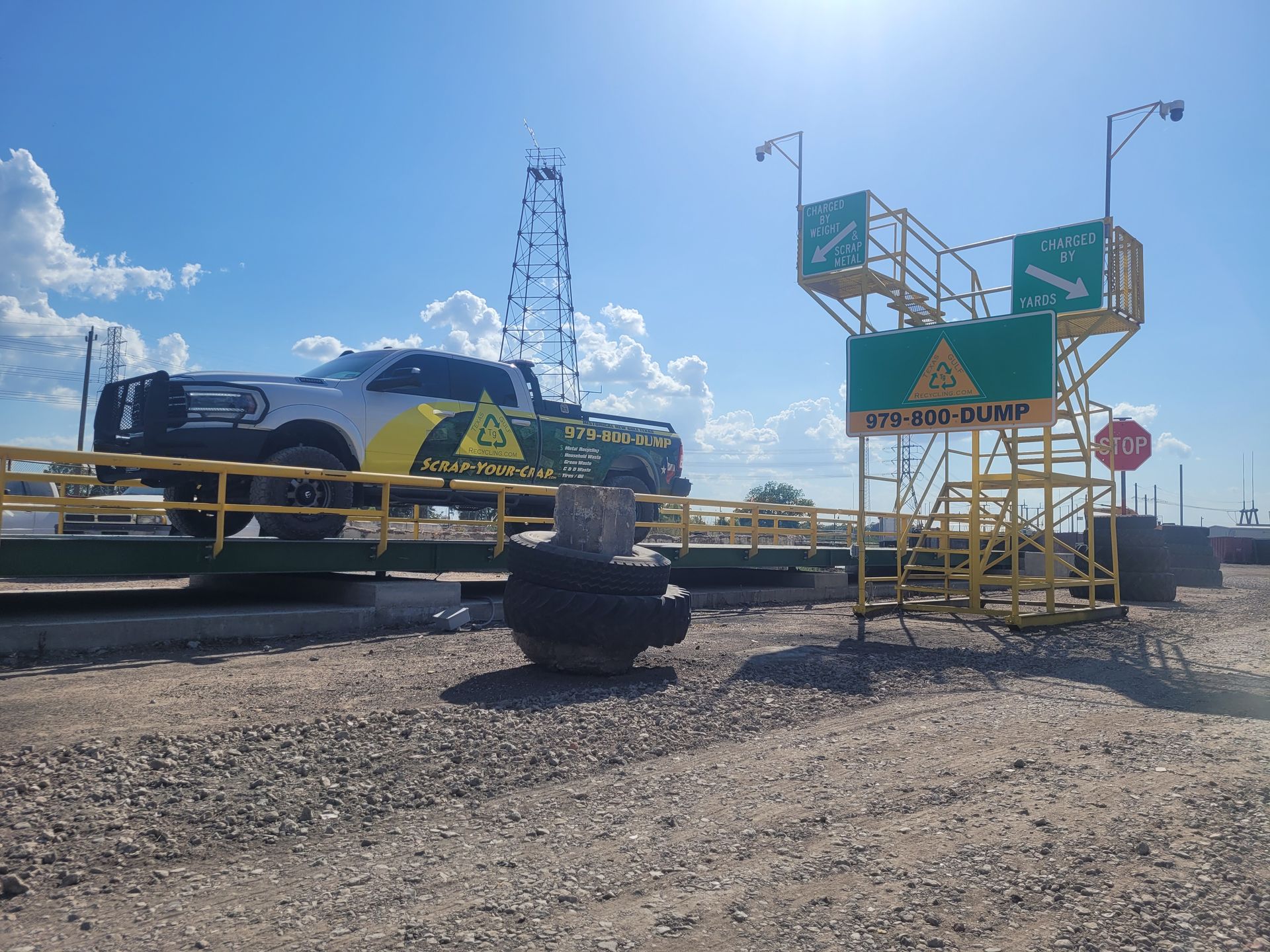 Drive you and your vehicle onto the green truck scale for your initial weight measurement.