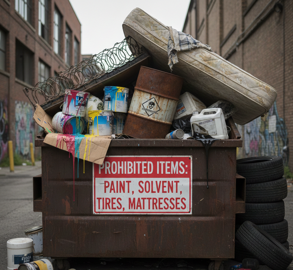 These items are prohibited under state and federal laws, local ordinances, and our facility's operating permits because they are hazardous, toxic, or require specialized processing. Placing any of these items in your rented dumpster can result in immediate removal and significant fines.